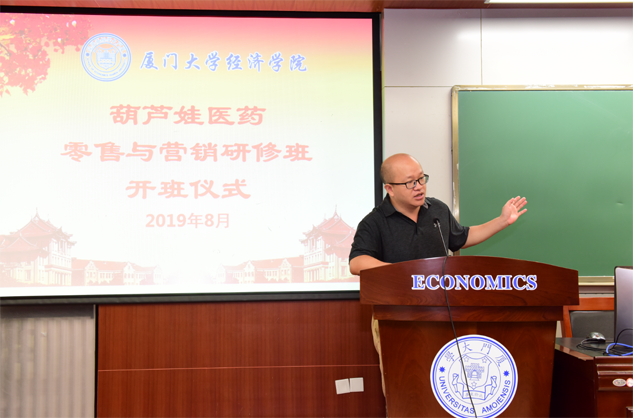 在开班仪式上,廖景峰主任首先代表厦门大学经济学院热烈欢迎德扑之星医药零售与营销研修班的学员到厦大学习,并就厦门大学及经济学院的相关情况进行了介绍。他说,德扑之星学员走进厦大就是厦大的校友,希望未来的日子能够关心、支持母校的发展,多提宝贵意见,同时他也祝大家在厦大学习期间学有所成、学有所获。